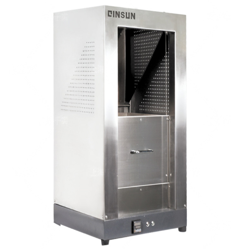 调湿后的试样放在测试箱中可移动的基座上,带有圆形切边的金属盘放在样品上。聚合物板片放在试样中心点燃,火焰熄灭后,即可进行测量以评价燃烧效果。建议把测试箱放在实验室通风橱中。
